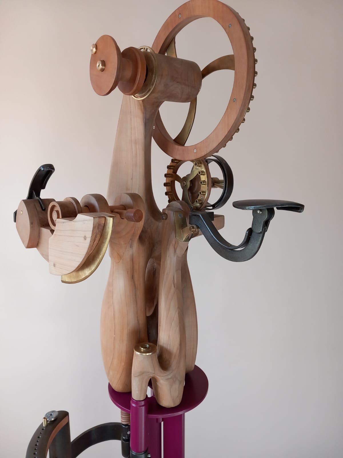 Realizzata attraverso l’assemblaggio di parti, che ricordano gli strumenti del calzolaio, si presenta come una struttura inanimata. Macchinari ed attrezzi, citati a somiglianza, rinviano a funzioni diverse, come tagliare, cucire, bucare o levigare il cuoio, tipiche di questo mestiere. Rimane tuttavia una macchina inutile, perché non destinata a produrre lavoro. Ė lo sguardo dell’osservatore che, percorrendo con motivato interesse l’intera composizione alla scoperta di significati possibili, può animarla e darle “senso”. Ė un invito discreto a guardare-vedere e a leggere, ricorrendo alla propria memoria, alle singole esperienze vissute, alla propria formazione culturale e letteraria. Linguaggi e mito si accompagnano alla comunicazione umana fin dai primordi. La loro proliferazione prosegue ancora oggi, in forme diverse e a volte non facili da comprendere. Qualche momento di pausa da un eccesso di informazioni invasive forse ci aiuta a ripensare. Ritagliarsi del tempo per recuperare il passato e riflettere sul presente, alla scoperta dei nuovi miti, nuove macchine, a dar loro un nome, un nomos appunto, e …