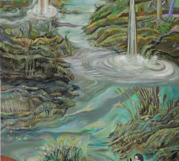 In questo mio “paesaggio culturale” si vede una cupa foresta in fiamme sullo sfondo, mentre in primo piano si contrappone una situazione idilliaca. Annabella Dugo biografia dell’artista